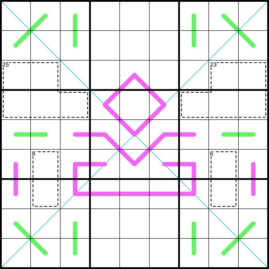 i approached this puzzle over multiple sessions - about 9 hours total. each step forward in the solve and the interplay of the constraints felt very rewarding. despite the time it took me i never really felt stuck and so never considered bifurcating. overall, several “a-ha” moments and no shortage of great sudoku. i rated this 5 stars for difficulty & loved the whole ride. thanks nico!
