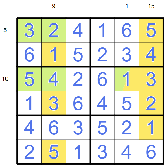 Green cells are valid Pointer cells for the row clues, and Yellow cells are valid Pointer cells for the column clues (only clued rows and columns are highlighted).