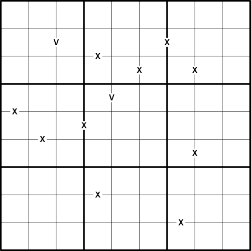 • In every pair of cells connected by an X or a V, one of the cells is smaller than all adjacent cells, and the other cell is greater than all adjacent cells.