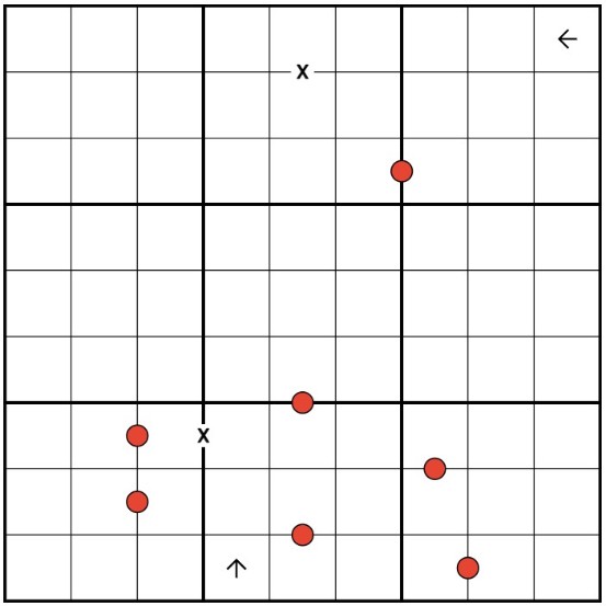 X's indicate cells that sum to 10, and red dots indicate cells that sum to 12.