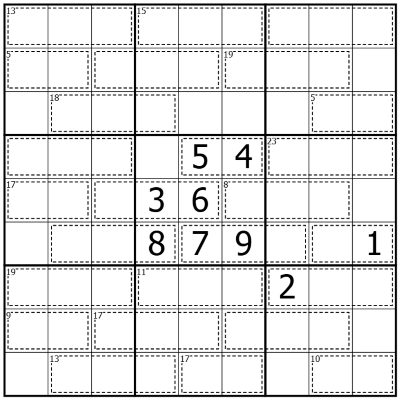 Cages mark "Vaults". Digits in a vault do NOT repeat. Digits orthogonally adjacent to a vault may NOT be included within that vault.
