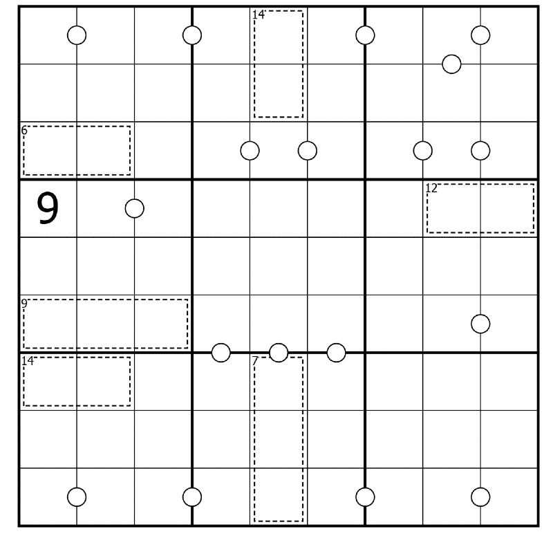 - Killer Cages: Digits in dotted-line cages must sum to the number in the top left corner of the cage. Digits may not repeat within a cage.