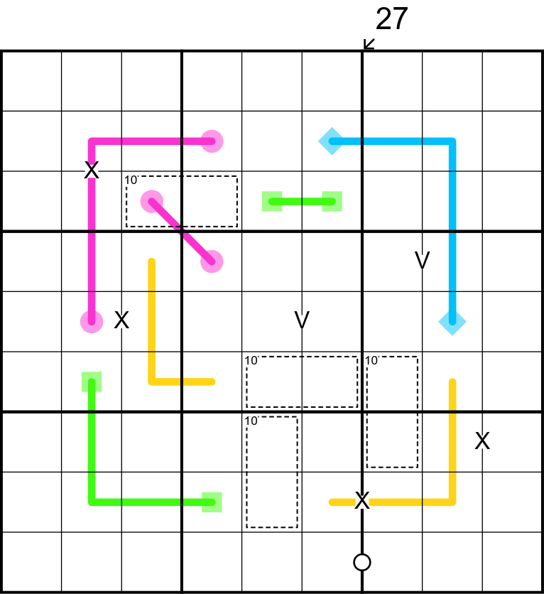 Thank you, very nice indeed. Got a bit stuck because at first I failed to realise that numbers could not repeat on the blue line. Did not need the 27.