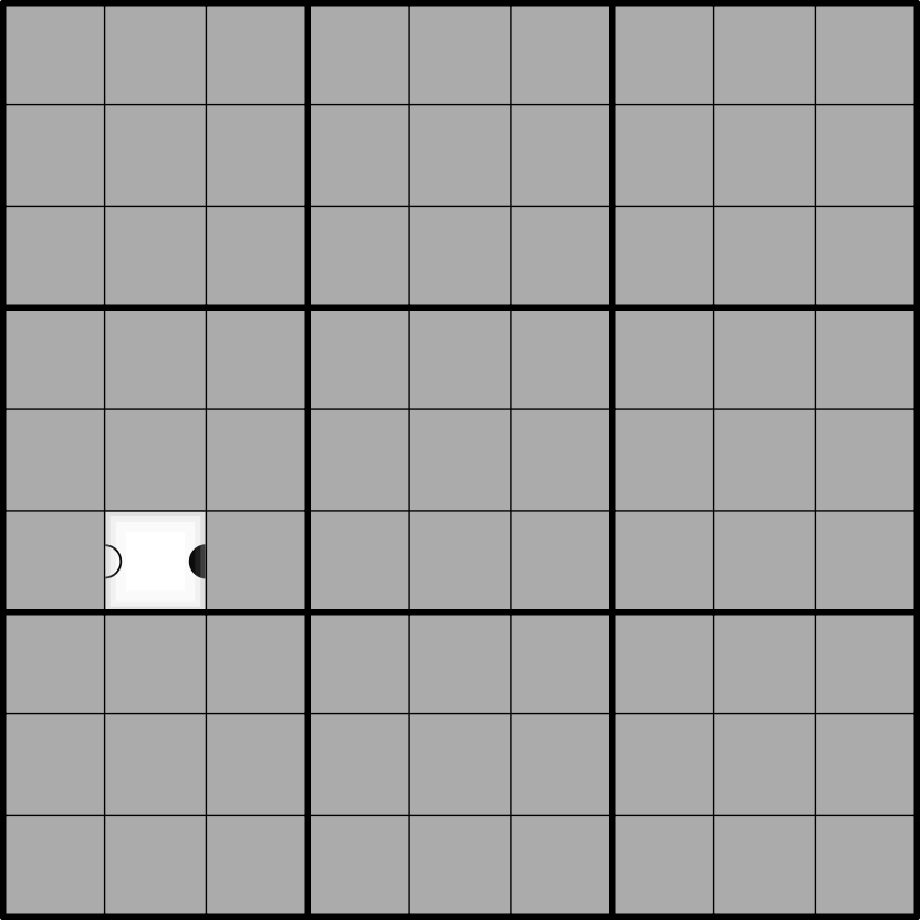 KROPKI DOTS: values of cells separated by a white dot are consecutive. Values of cells separated by a black dot are in a 1:2 ratio.