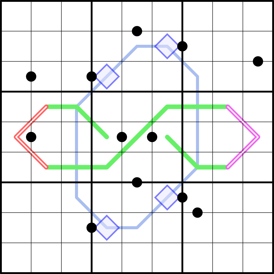 - Lockout Lines - digits along a lockout line must not be between or equal to the two end digits shown in blue diamonds. The two diamonds on a lockout line must differ by at least 4.