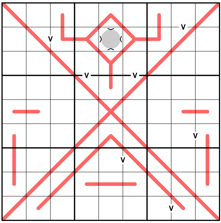 Chinese Whispers: Digits connected by a red line (even the ones marking the diagonals) have a difference of at most 2