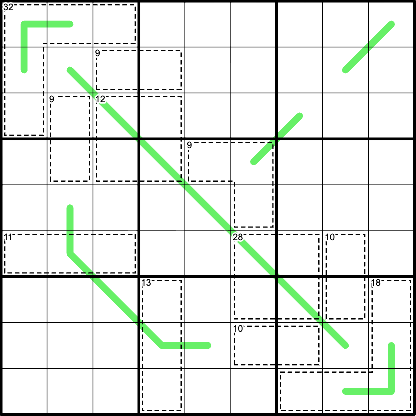Digits in a cage do not repeat and must sum to the number in the top-left corner.