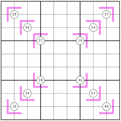 Digits in circles must appear in a cell touching the circle.