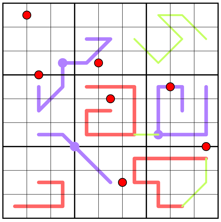 Red "Kropki" dots: Digits separated by a red "Kropki" dot are coprime. That is, they have a greatest common factor of 1. Not all dots are given