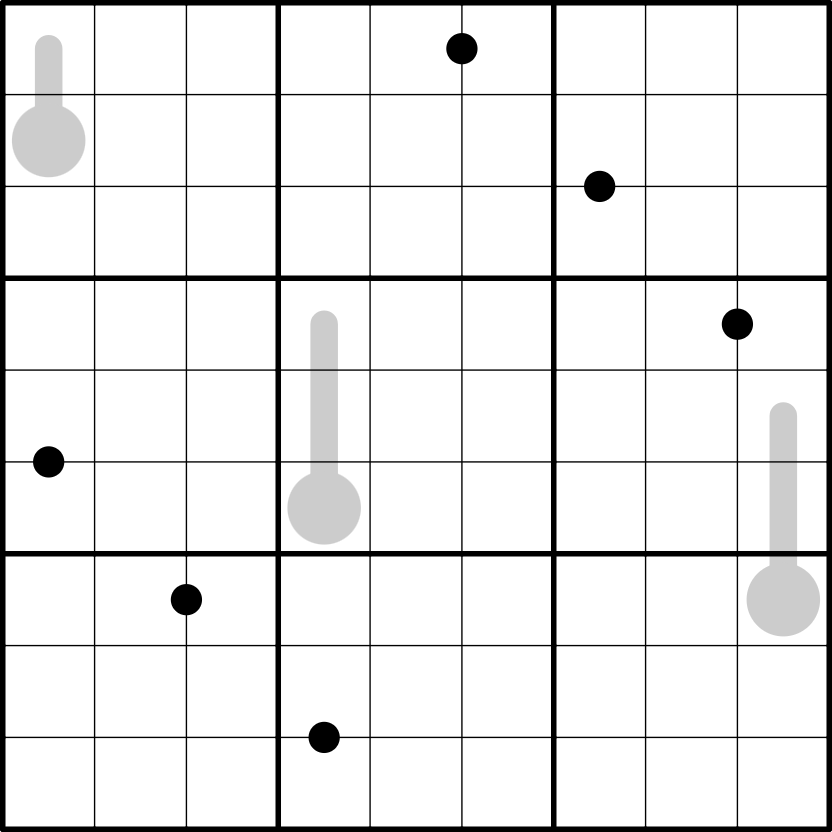 - Full Black Kropki: Digits separated by a black dot have a 1:2 ratio. All possible black dots are given.