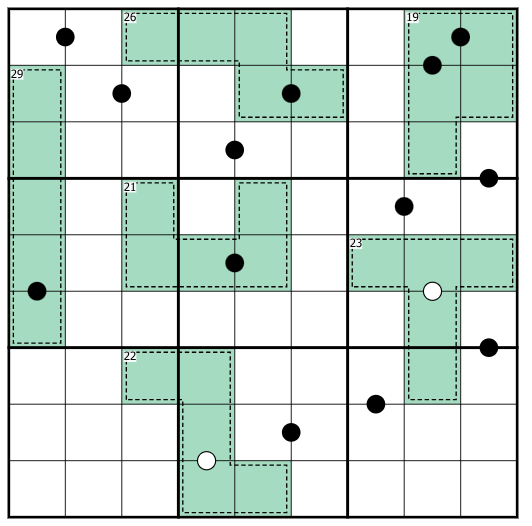 All dots are included in the pentominoes. All black dots are included in the white areas.