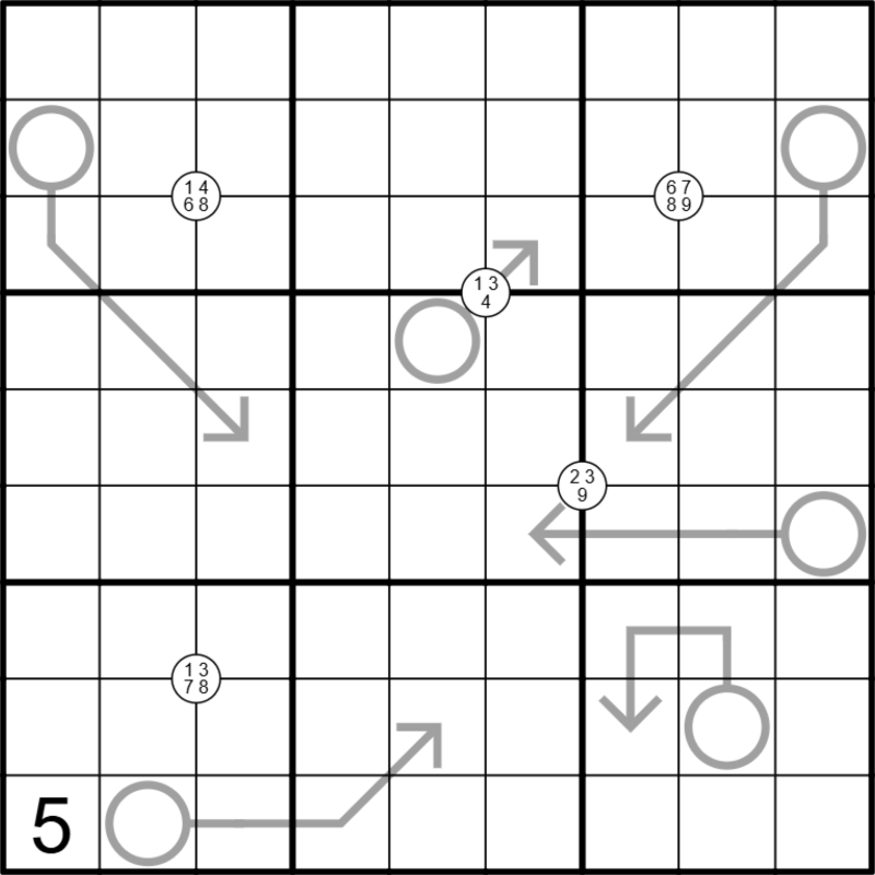 Arrows: Digits on an arrow must sum to the digit in the arrow's circle
