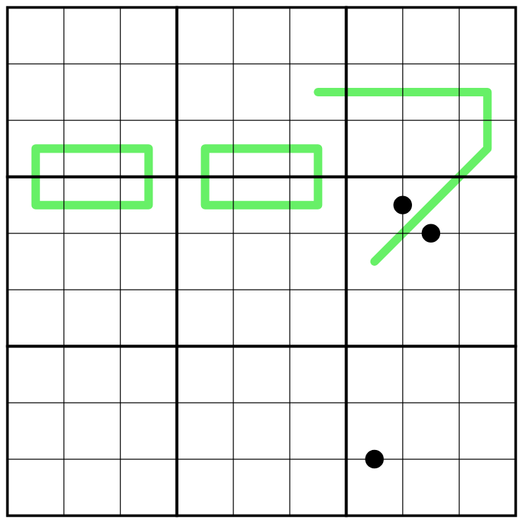 olima: Thank you for your comment. I've had many versions of this puzzle, also without the double-3-in-the-corner-restriction and without the green 7-line poking into column 6 leading to a unique solution by two different dots in box 6, but this was even quadfurcational. ;).