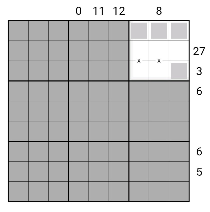 Cells on blue region sum lines must sum to the same amount in each 3x3 region.