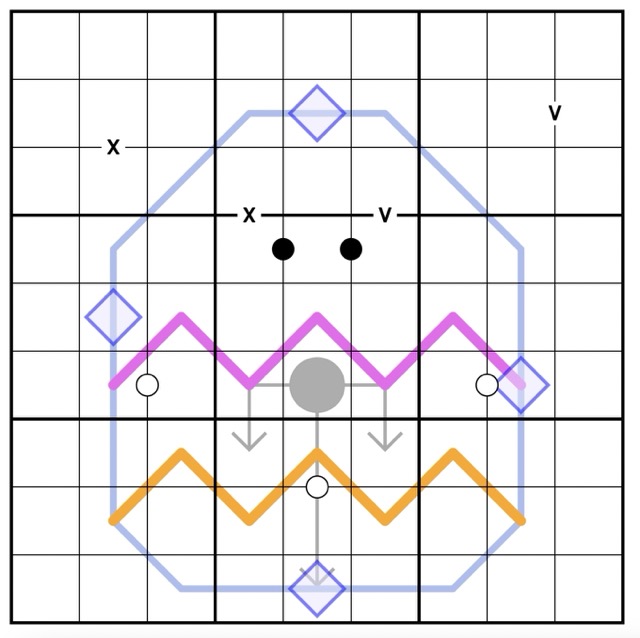 The blue lines with diamonds are Lockout lines. The digits along a line must lie outside the range of the digits in the two diamonds at the end. The diamonds at opposing ends of the line must have a difference of at least four.