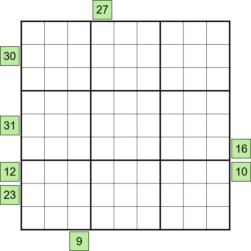 A clue outside the grid gives the sum of all continuously adjacent digits with a difference of at least 5 up to (and not including) the first digit with a difference of 4 or less in that row or column from the direction of the clue. A digit in the first cell is always included in the sum.
