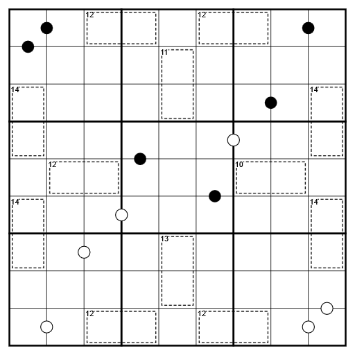 - Kropki: Digits joined by a black dot have a 1:2 ratio. Digits joined by a white dot are consecutive. (Not all dots are given.)