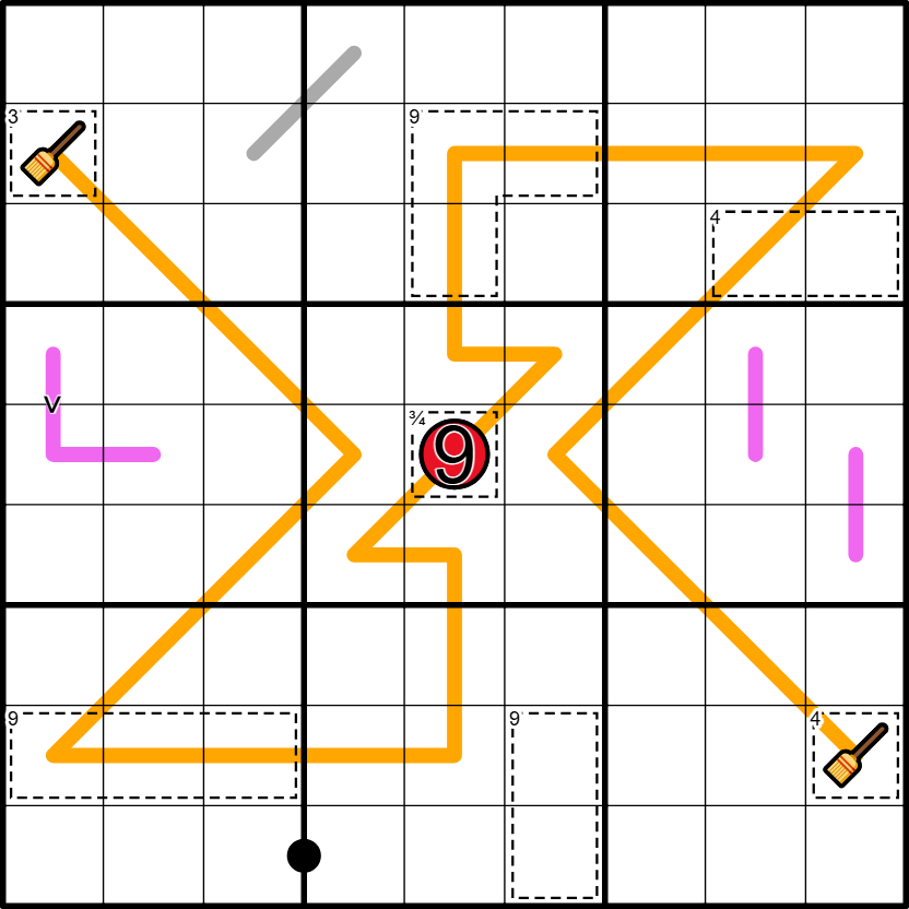 Race Paths: Adjacent cells on orange lines must differ by at least 4. Two paths start from broomsticks; the path with the LOWER total sum is the winner (Dutch Whispers).