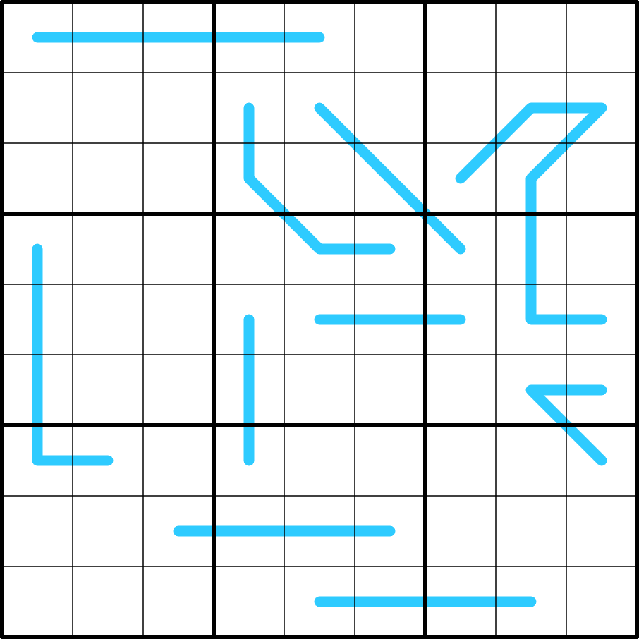 Normal Sudoku rules apply. Box borders divide blue lines into segments with the same sum. Different blue lines can have different sums. If two digits (called x and y) are (orthogonally or diagonally) adjacent along a blue line, then x as well as y has to be an integer multiple of the difference between x and y. For example, 6 and 4 are allowed to be adjacent on a blue line since both 6 and 4 are a multiple of 2 (the difference between 4 and 6).
