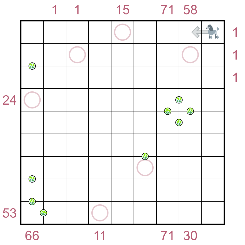 - Clues outside the grid give the value sum of the first X cells seen from the clue in its respective row or column where X is the value of the cell closest to the clue.