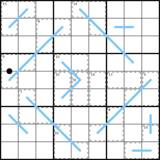 KILLER CAGES- Numbers in cages sum to the number in the top left corner of the cage. Numbers may not repeat in cages. The number ten is duplicated in two cages because blue lines can obscure it in some formats.