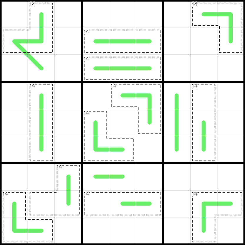 German whisper lines: Two cells connected by green German whisper lines must have a difference of at least 5.