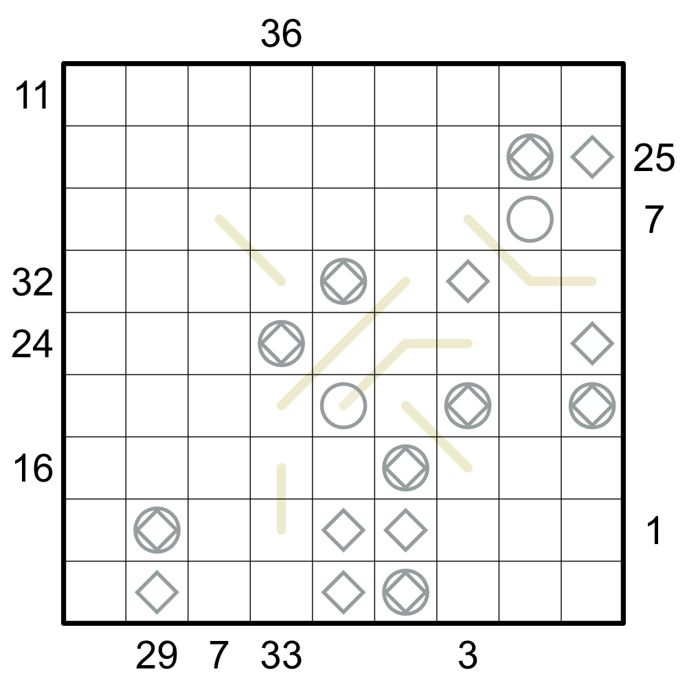 • One of the digits in a cell marked with a diamond is equal to the count of the up to 8 neighboring cells of the opposite shading group.
