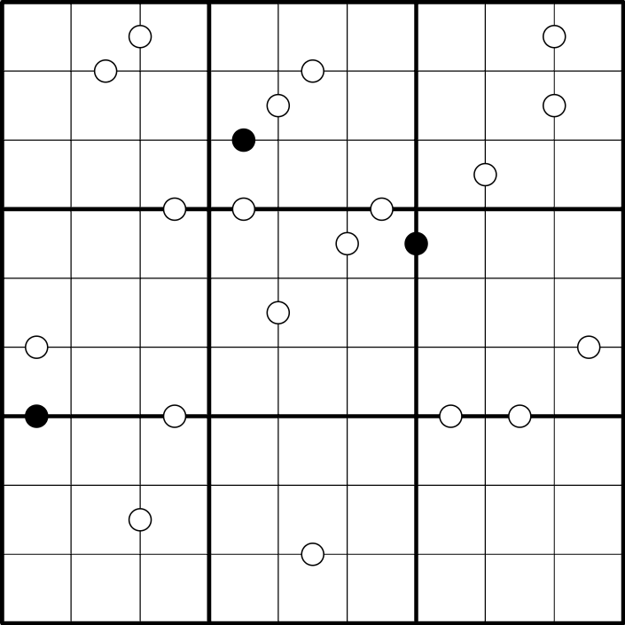 Black Dots: A black dot indicates that one digit is exactly double the other. Black dots only appear between cells of the same color.