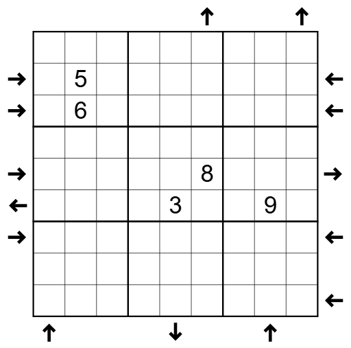Rossini: Arrows indicate the direction in which the first three digits in that row or column (nearest the arrow) increase or decrease. For instance, r7c1 is less than r7c2 is less than r7c3. If no arrow appears adjacent to a row or column, the three nearest digits must not be in increasing or decreasing order (that is, the central digit must be the highest or lowest).