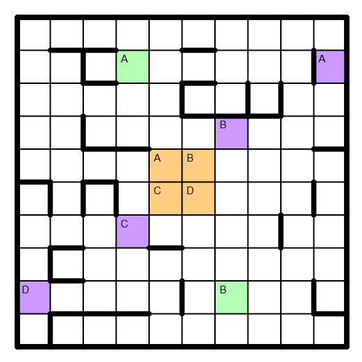 In jedes Feld ist eine Zahl von 1 bis 4 einzutragen, so daß jede Zahl angibt, wie viele verschiedene Zahlen sich in den orthogonal benachbarten Feldern befinden. Befindet sich zwischen zwei Feldern eine dicke Linie so sind diese nicht benachbart.