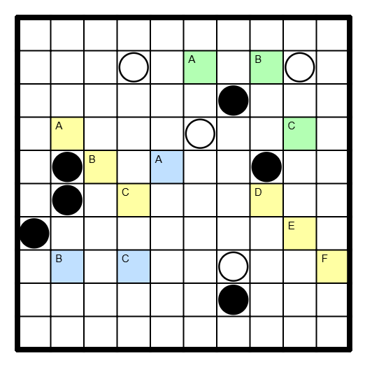 In jedes leere Feld ist entweder ein schwarzer oder ein weißer Kreis einzutragen, so daß alle Kreise einer Farbe orthogonal zusammenhängen und kein 2x2-Bereich komplett mit Kreisen einer Farbe gefüllt ist.