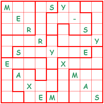 Plaziere die Buchstaben A, E, M, R, S, X und Y in jede Zeile, Spalte, und jedes fett umrandete Gebiet.