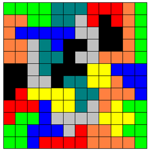 Das Diagramm 2 zeigt viele bunte Gebiete. Alle Gebiete haben entweder die Gebietssummen 35, 36 oder 37. Gleichfarbige Felder haben auch die gleichen Gebietssummen. Aber Achtung!! Innerhalb der gefärbten Gebiete können auch Zahlen mehrfach vorkommen!