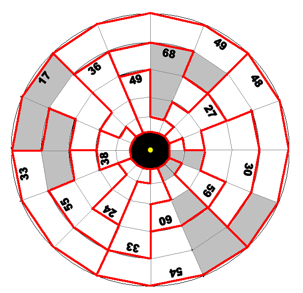 Trage in jedes Feld des Diagramms die Zahlen 1 bis 16 ein, sodaß in jedem Kreis, jedem Gebiet und jeder Diagonalen (10 Zahlen) jede dieser Zahlen höchstens einmal vorkommt.