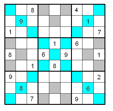 Trage in das unten stehende Gitter die Zahlen 1 bis 9 so ein, dass sich in keiner Zeile, keiner Spalte, keiner Hauptdiagonalen und keinem 3x3 Gebiet eine Zahl wiederholt.