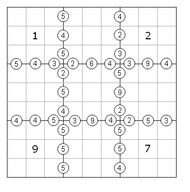 In das untere Diagramm müssen die Zahlen zwischen 1 und 9 eingetragen werden, sodass sich in keiner Zeile, Spalte oder 3x3 Gebiet eine Zahl wiederholt.