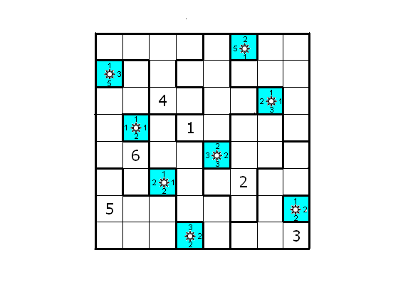 Die blauen Felder sind Karussells. Die Zahlen in diesen Gebieten geben Hochhausbedingungen an. Diese beziehen sich nur auf die weißen Felder. Die blauen Felder können gedreht werden. Die Zahlen müssen jedoch immer senkrecht oder waagerecht in das Diagramm hineinweisen.