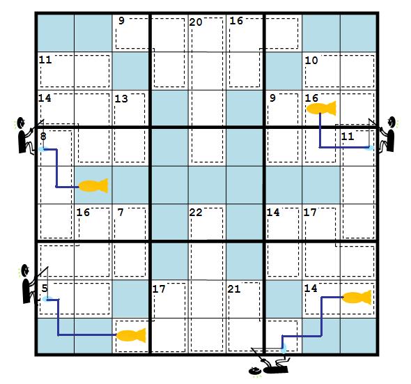 Die blaue Linie endet im Kästchen vor dem Fisch. Zählt der Fisch noch als auf der Linie liegend? Oder muss man den Fisch nicht berücksichtigen bei den aufsteigenden Zahlen?