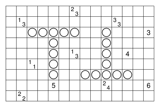 The loop must not pass cells containing numbers. A number determines how many of the neighbouring cells are used by the loop. These cells must form a group not interrupted by empty cells, but need not to be a contiguous part of the loop. Distinct groups of loop cells around the same numeric cell must be partened by at least one empty cell.