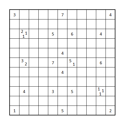 Ordne jede Hinweisziffer den Rätselarten Tapa oder Höhle zu und löse danach das Kombinationsrätsel aus Tapa und Höhle. Dabei stellen die Schwarzfelder der Tapa's die Weißfelder der Höhle dar und umgekehrt (siehe Beispiel).