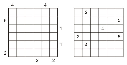 Place buildings in the cells of the left grid. Some buildings have a basement, i.e. their visible height is reduced by exactly 1. For example, only three levels of a 4-building are visible, a 1-building is not visible at all.