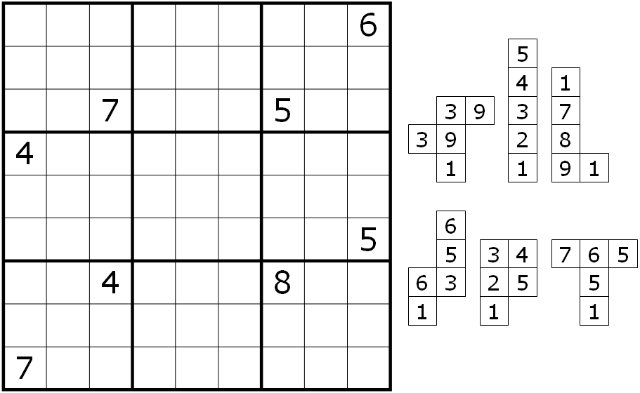 Platziere die Ziffern von 1 bis 9 in jede Zeile, Spalte und jeden 3x3-Block. Platziere die gegebenen Figuren im Gitter ohne sie zu drehen oder zu spiegeln. Figuren dürfen einander berühren, aber sie dürfen sich weder gegenseitig überlappen noch die gegebenen Ziffern.