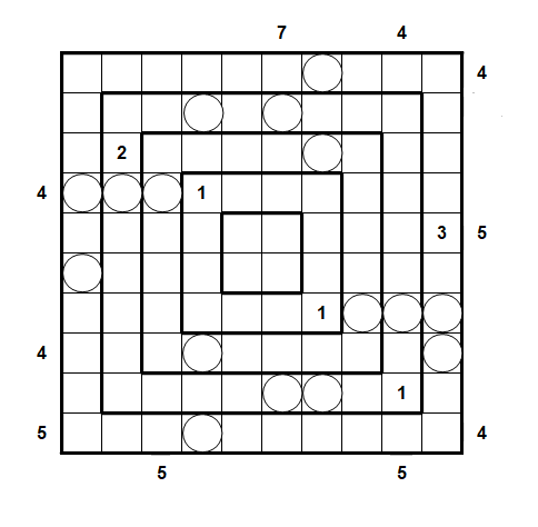 Fill each cell with a digit from 1 to 10. Every digit must appear once in any row or column. Every digit inside the grid represents a building with a specific height. The digits outside the grid indicates the number of buildings visible from that direction. In addition, some fields are marked with cirles. The numbers entered in these fields must show how many skyscrapers are visible from that place in the inner 8x8, 6x6, 4x4 and 2x2 sguare respective. All these fields are marked.