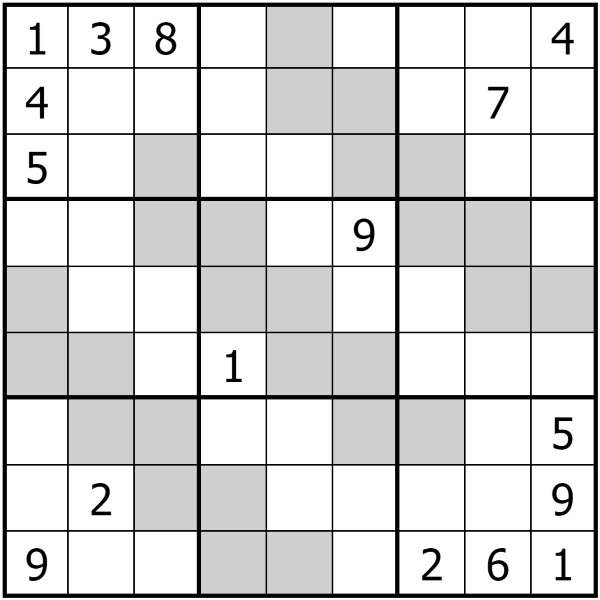 General Rules: Place a digit from 1-9 into each cell of the grid so that every row, column and outlined 3x3 region contains each digit exactly once.