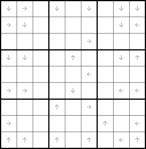 When a cell contains an arrow, the value of the cell shows how many cells share the same color with the cell in the given direction. E.g. when a cell is colored green, has an arrow pointing to the right and it's value is 3, there must be exactly 3 green cells in the given row right to (and not counting) the pivot cell. Not every possible arrow is given and the same-color cells are not necessarily next to each other or connected to the pivot cell.