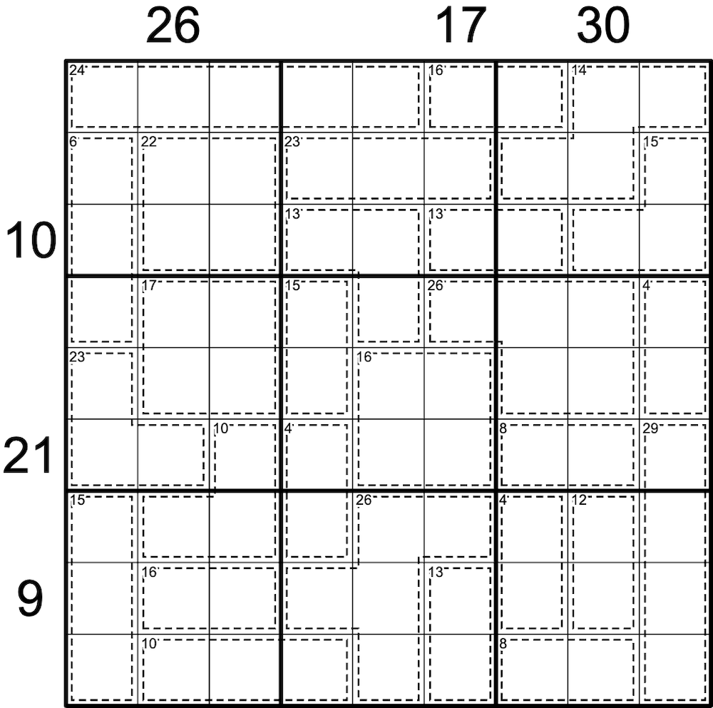 Es gelten die üblichen Killer-Sudoku-Regeln, aber die Käfigsummen sind <u>manchmal</u> richtig, wenn sie eine 5 enthalten, <u>immer</u> richtig, wenn sie eine 1 enthalten, und <u>nie</u> richtig, wenn sie eine 9 enthalten. Summen, die falsch sind, sind um 1 daneben ('knapp daneben').