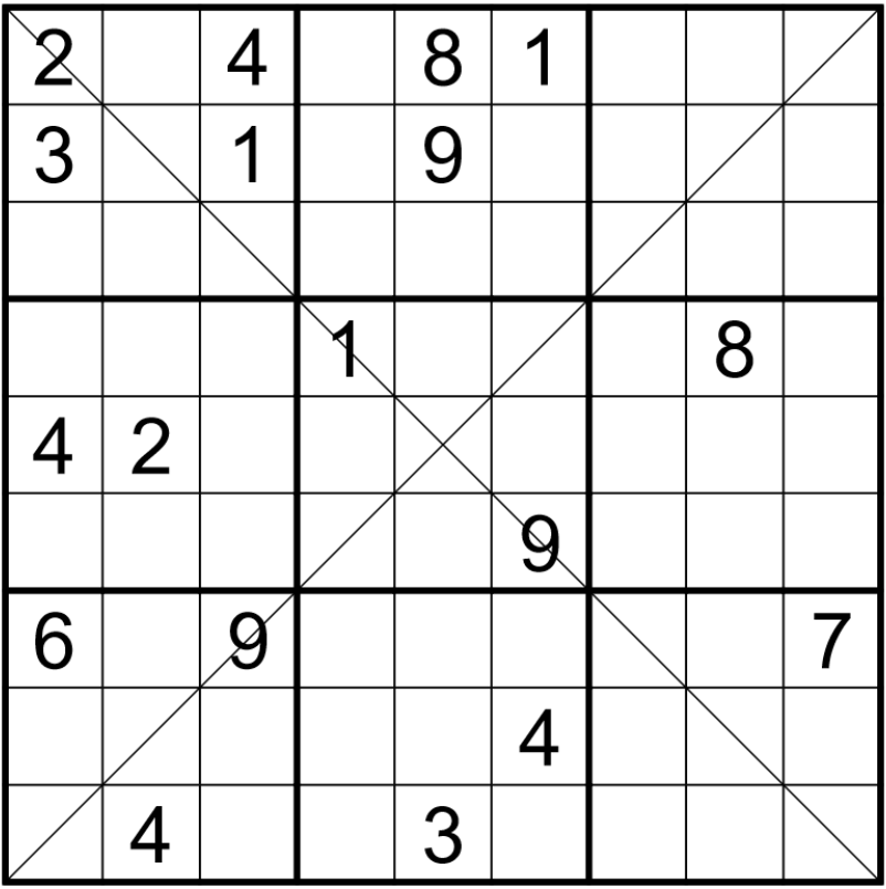 Die zwei Hauptdiagonalen müssen ebenfalls jeweils alle Ziffern von 1 bis 9 beinhalten.