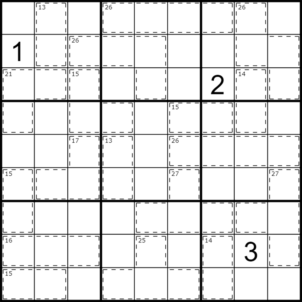 - Number in the corner of a cage indicates sum of the digits within the cage