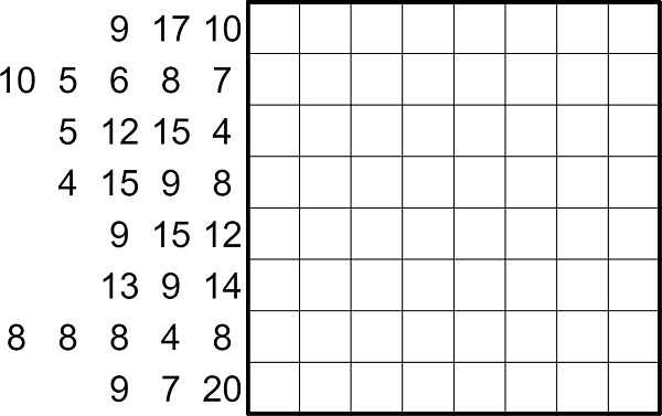 Place digits 1-8 into all empty cells such that no digit is repeated within a row or column. Additionally, draw a single closed loop that travels horizontally and vertically through all cells of the grid. Clues outside the grid indicate the sums of the digits on each loop segment in the respective row, in the correct order.