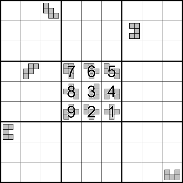 The five cells of the Pentomic Renban Set defined by each Exploding Pentomino occupy the same position in each 3x3 box.